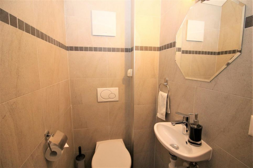 Cuisine ouverte avec terrasse, grand salon, 2 chambres, une salle de bain/douche à l'italienne et WC visiteur.